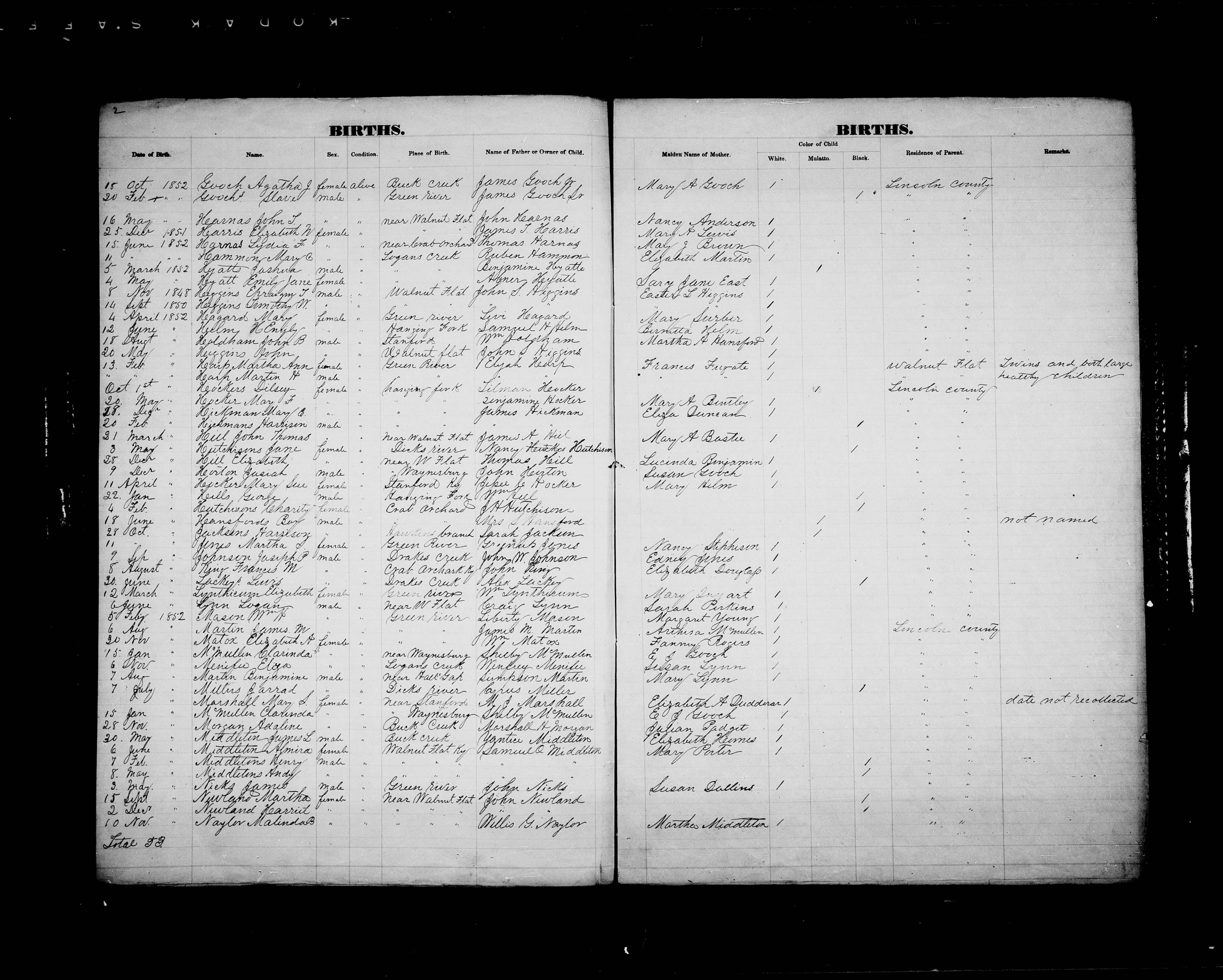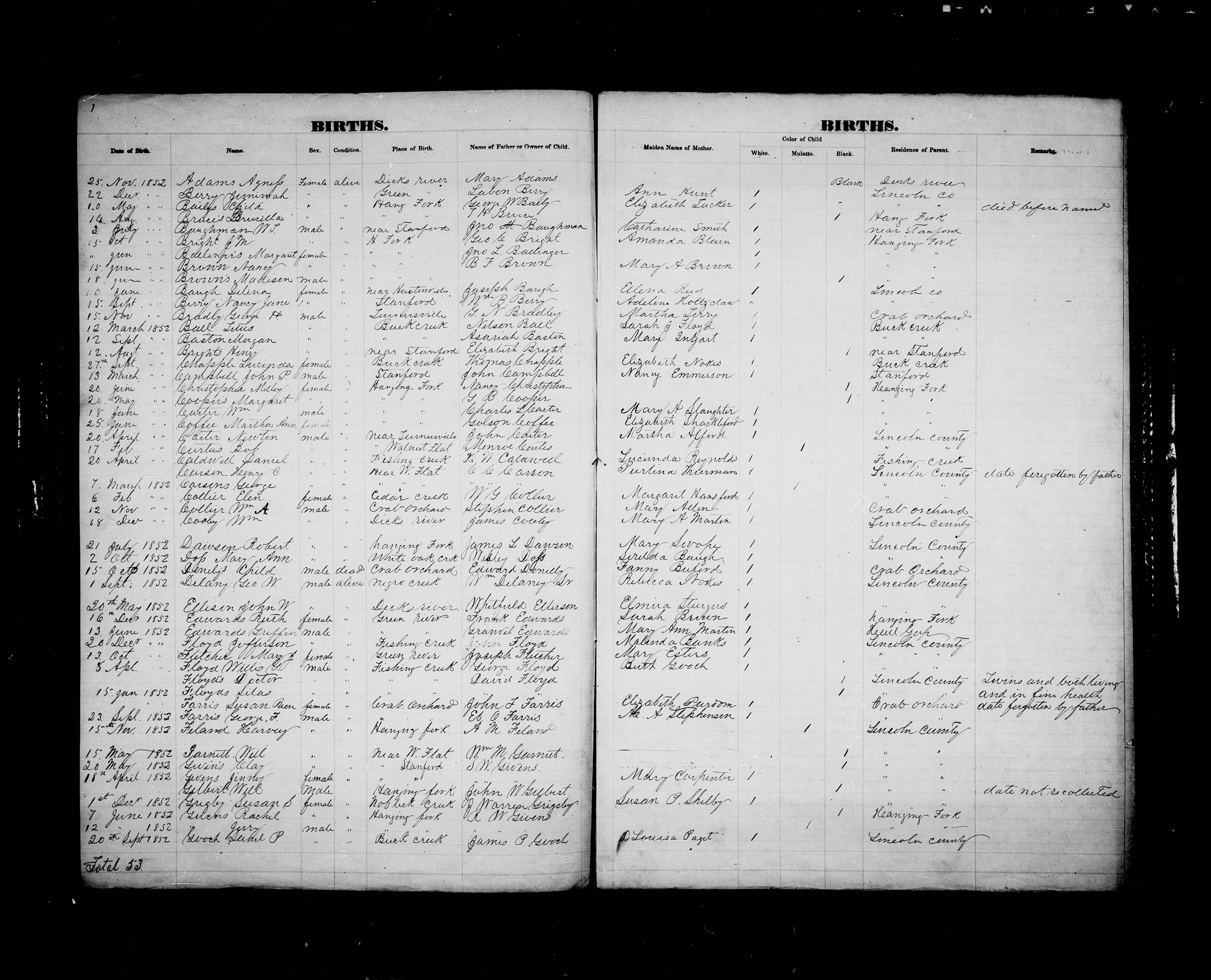 Lincoln County Birth Register - 1852