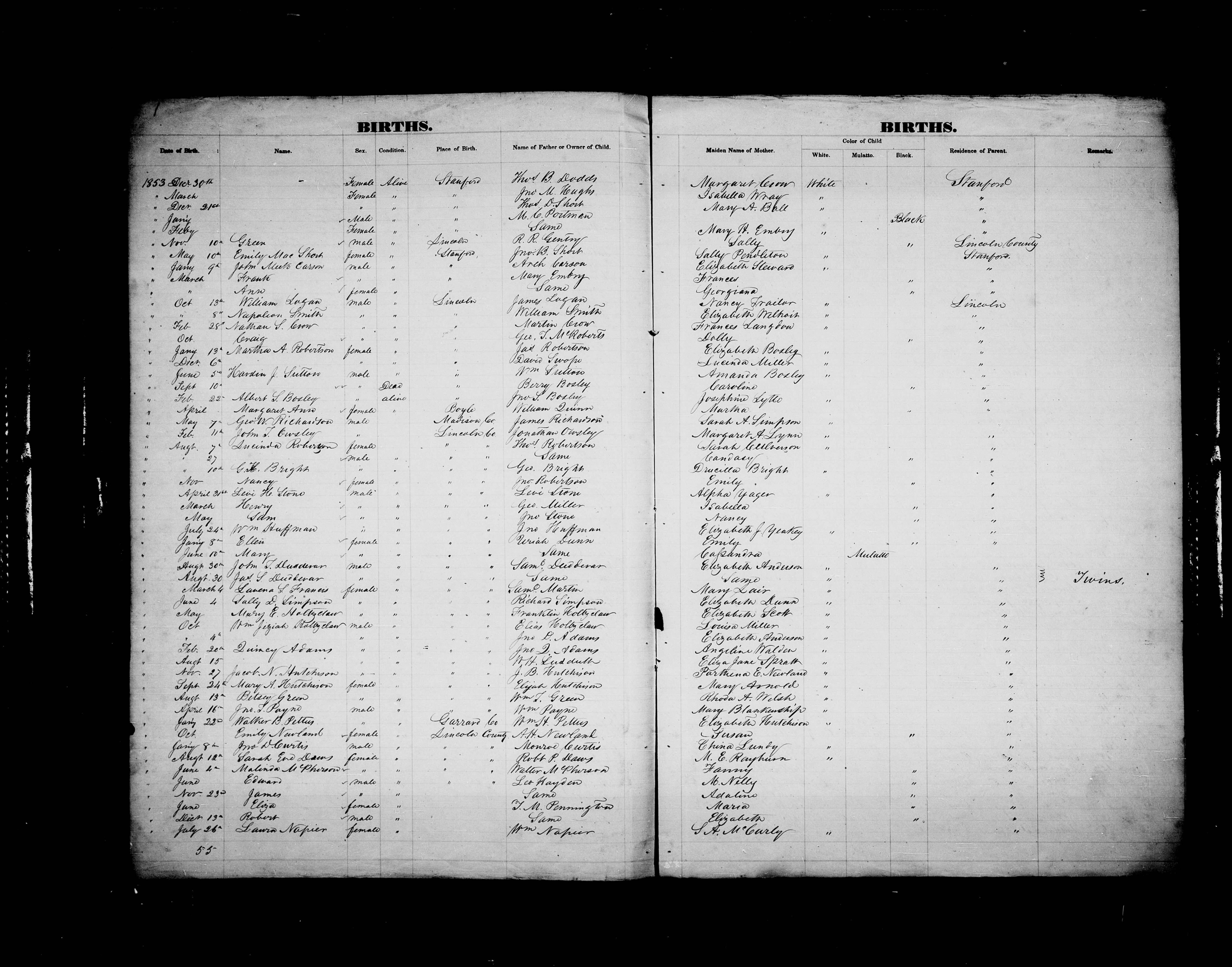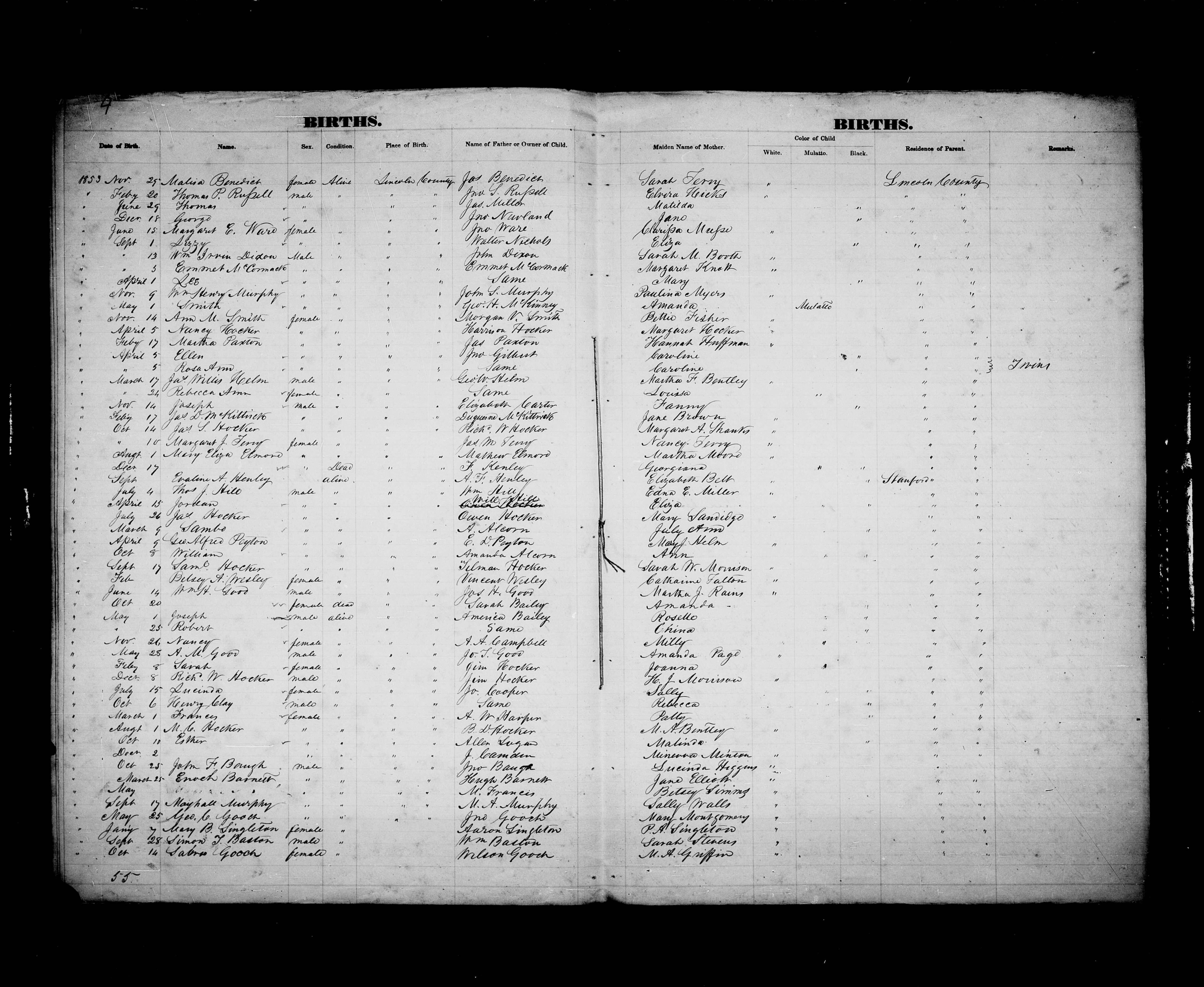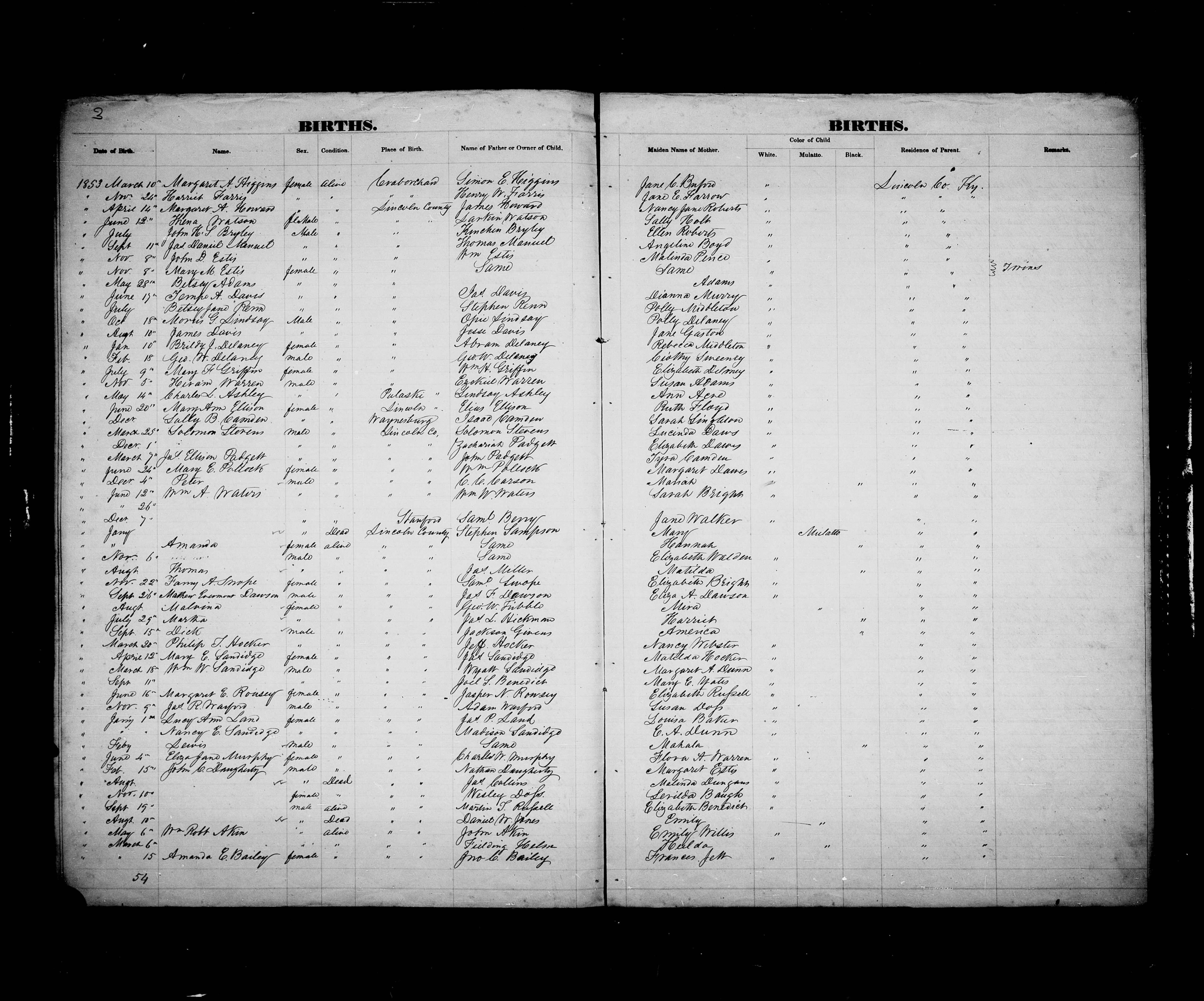 Lincoln County Birth Register - 1853
