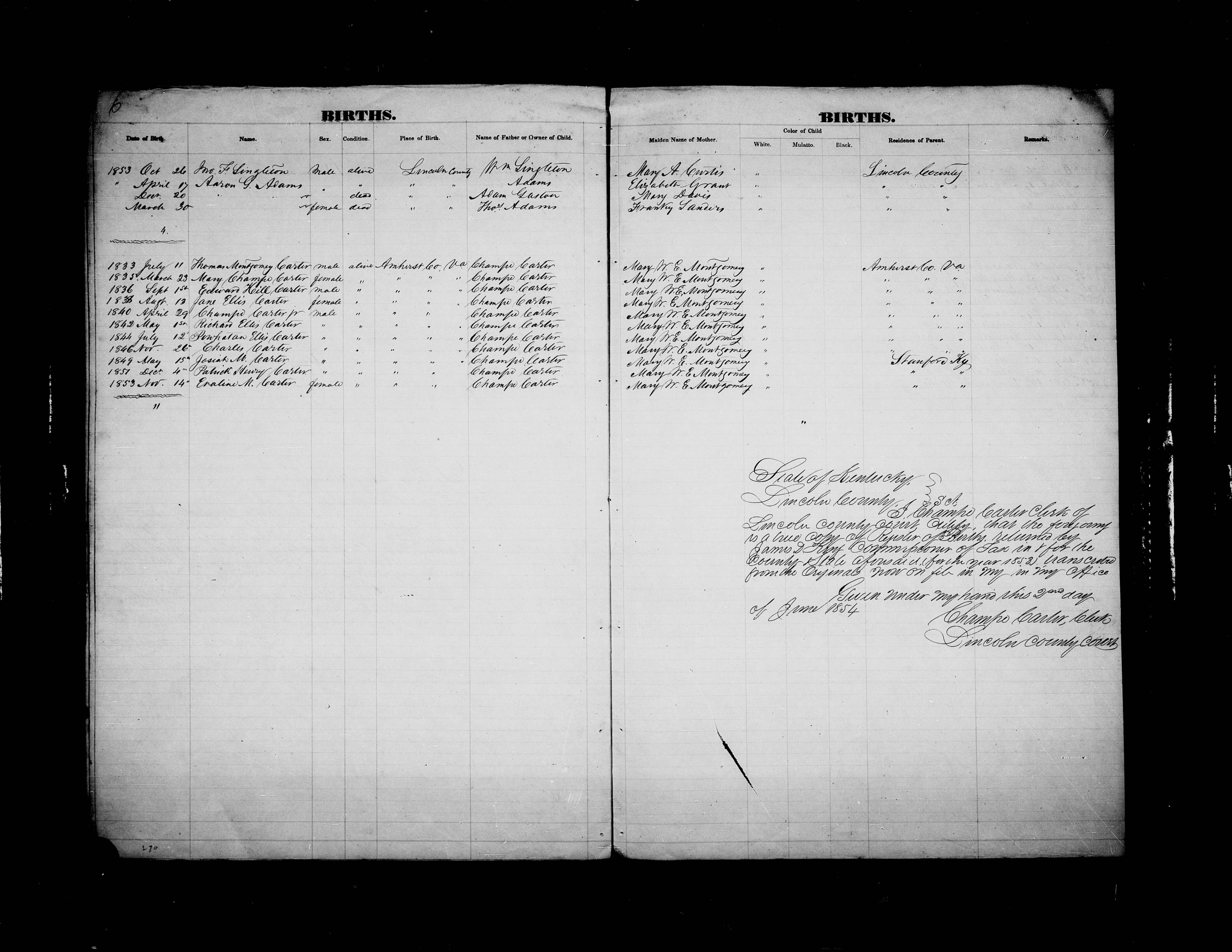 | 14 Nov 1853 | Carter Evaline M | F | Champe Carter | Mary W E Montgomery | W | |||