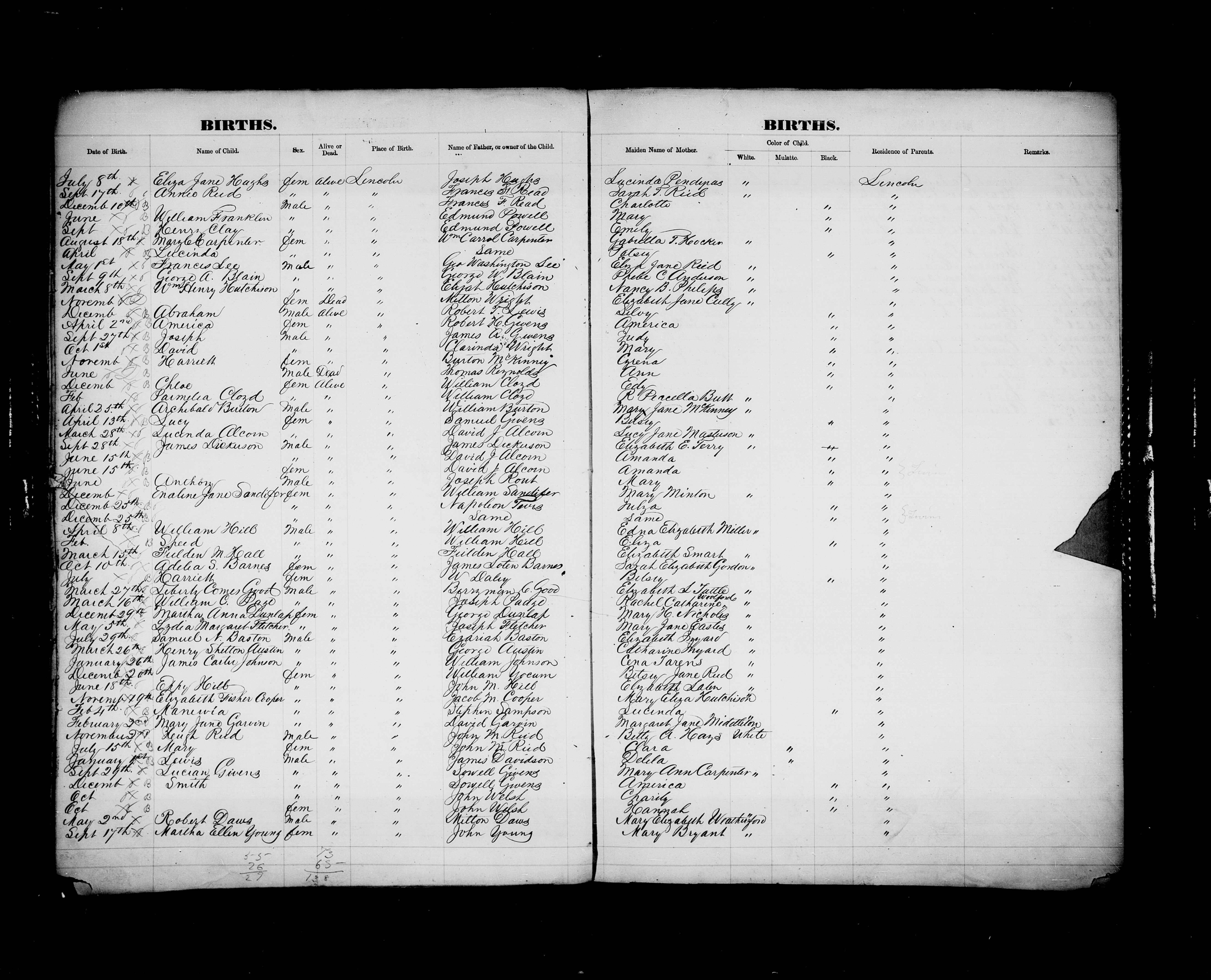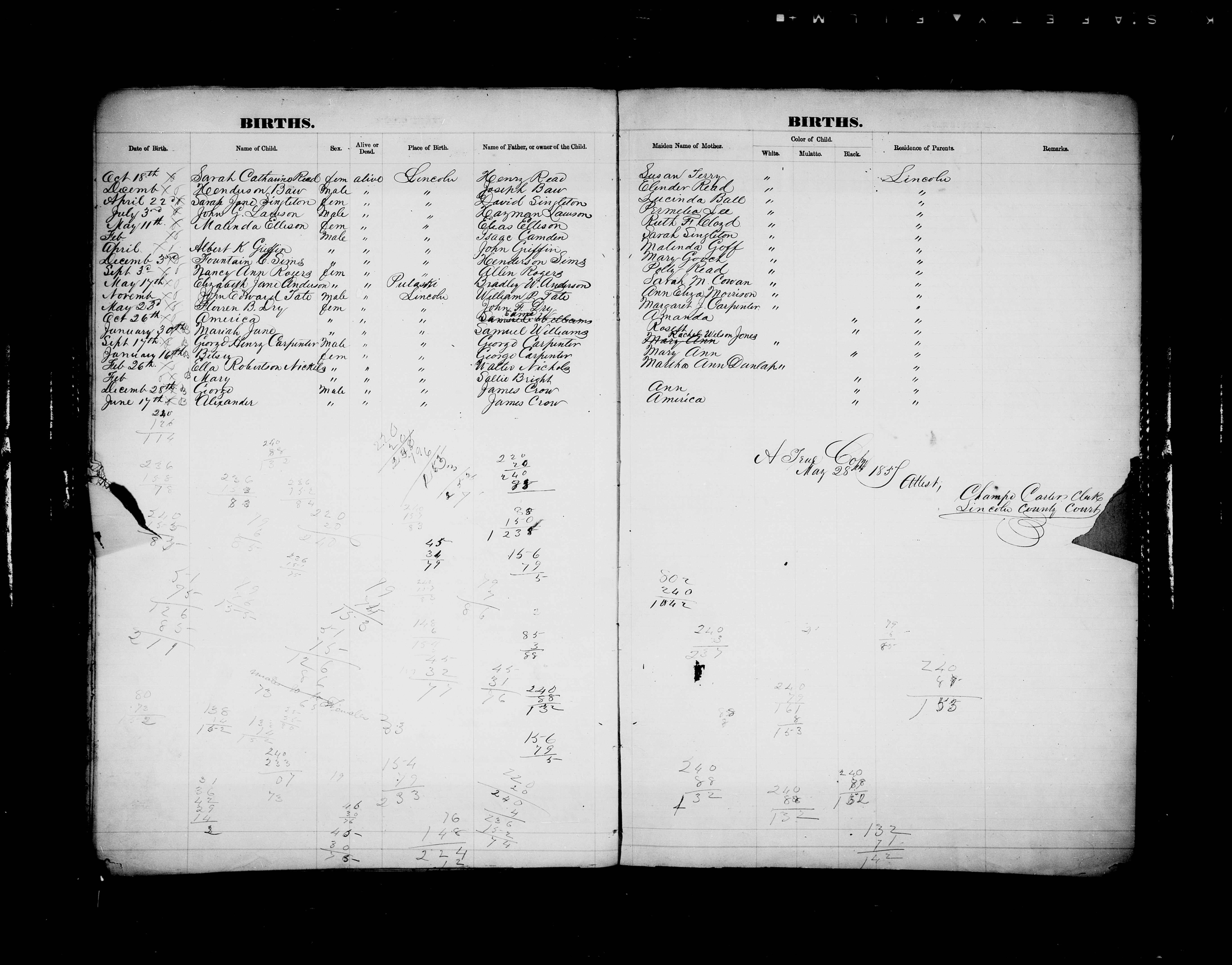 Lincoln County Births - 1856