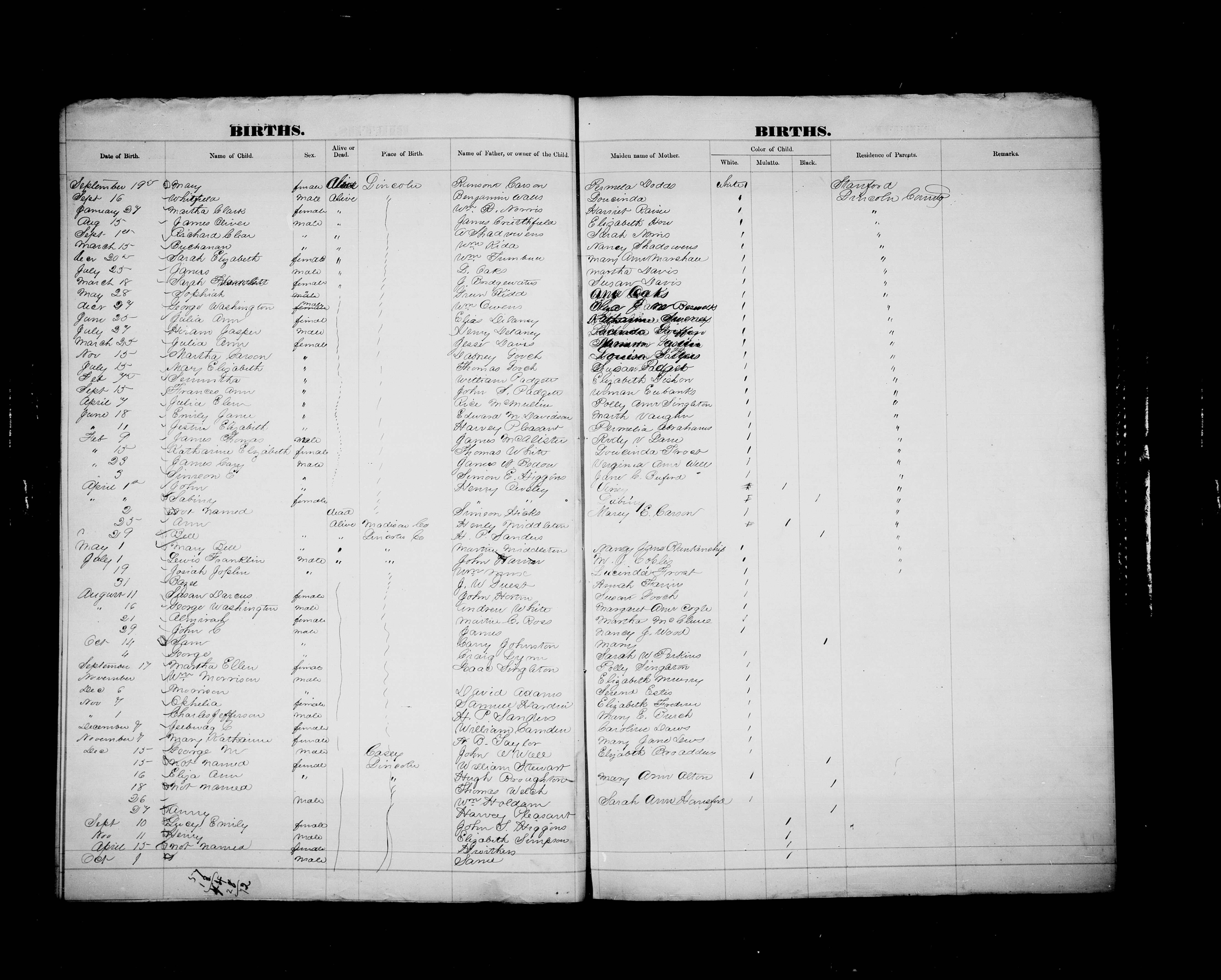 Lincoln County Births - 1858