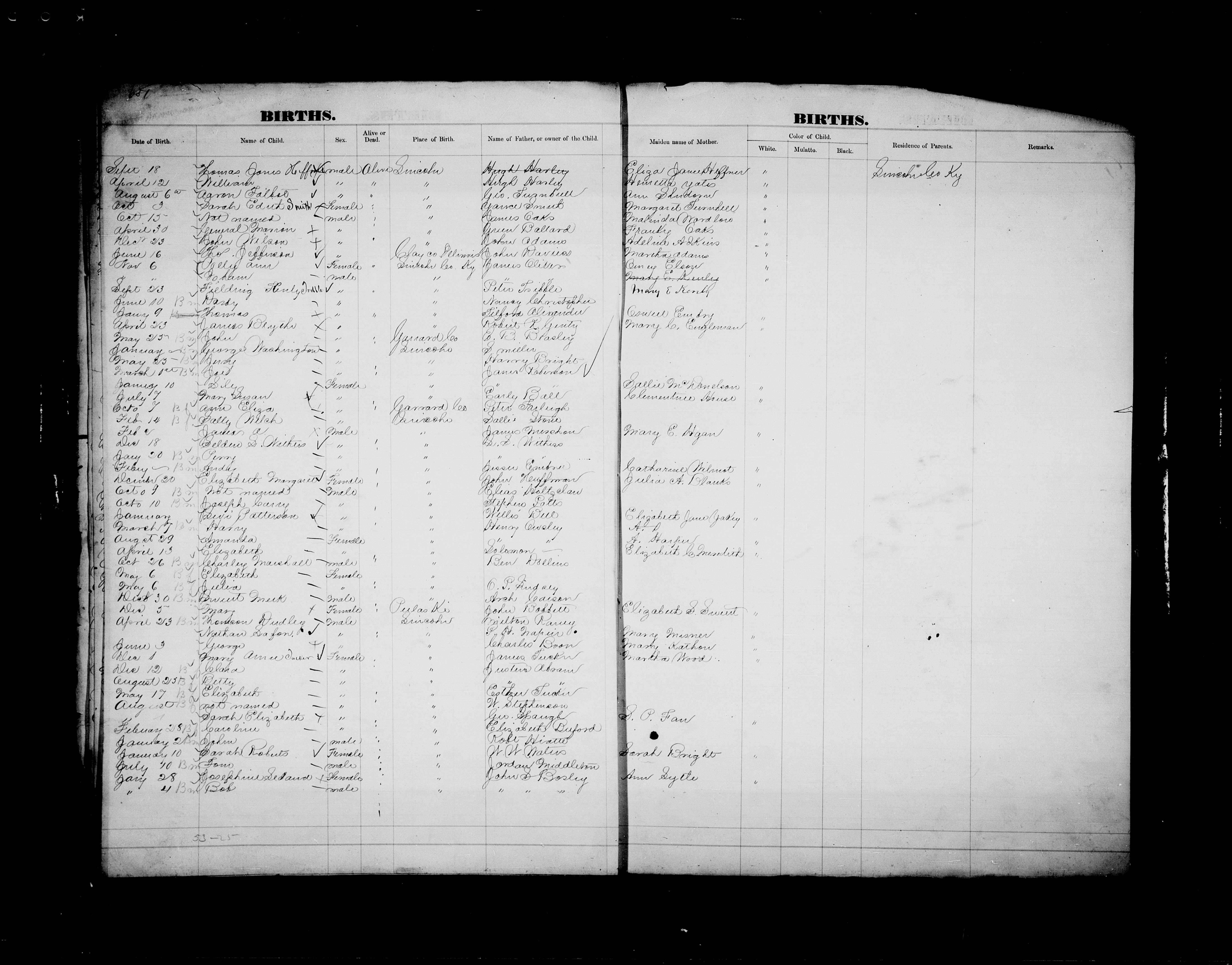 Transcribed from the original county birth returns (filed under the 1852 Sutton Law ). All births were recorded in a single list regardless of race. "Color" is shown as originally noted (W = White, B = Black/Colored, M = Mulatto). For many enslaved births, only the mother's name and sometimes the enslaver appear; fathers are rarely listed. Sources: Kentucky vital records microfilm via KDLA / Ancestry transcriptions.